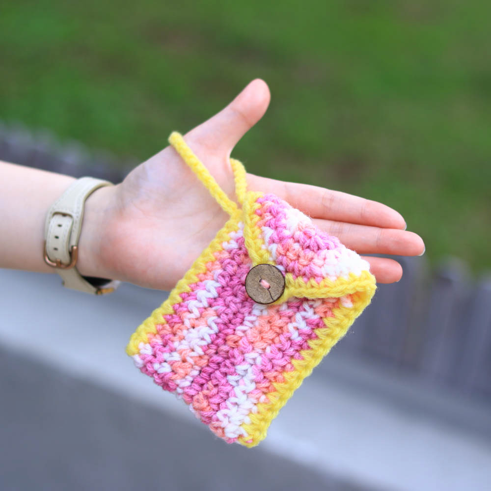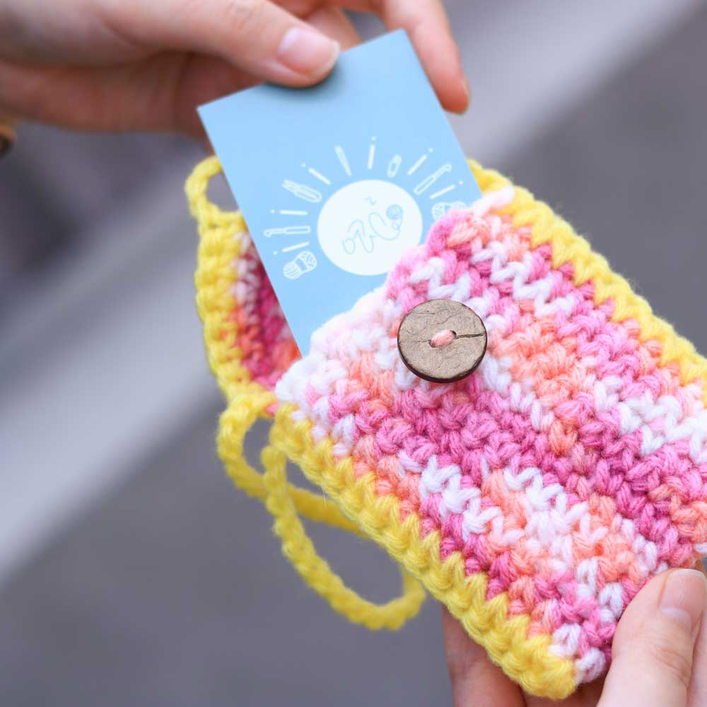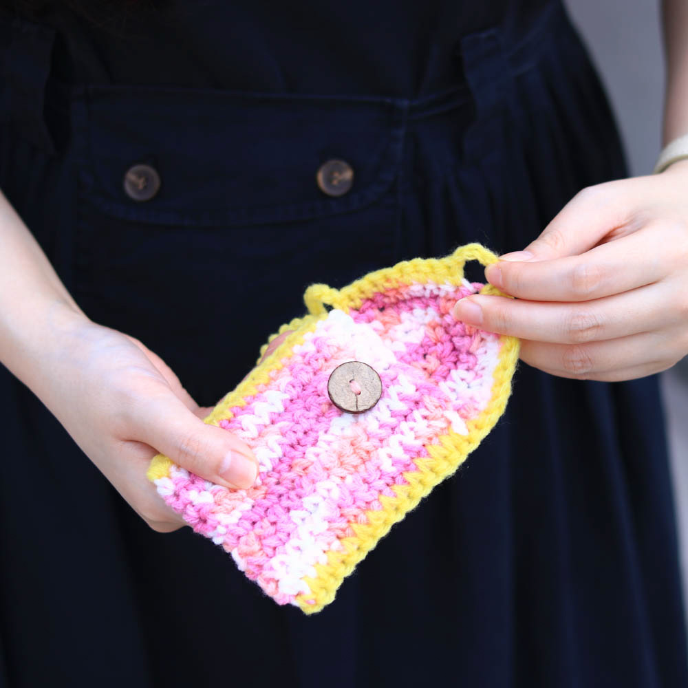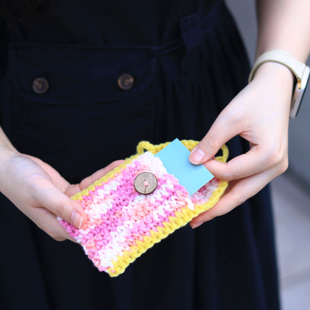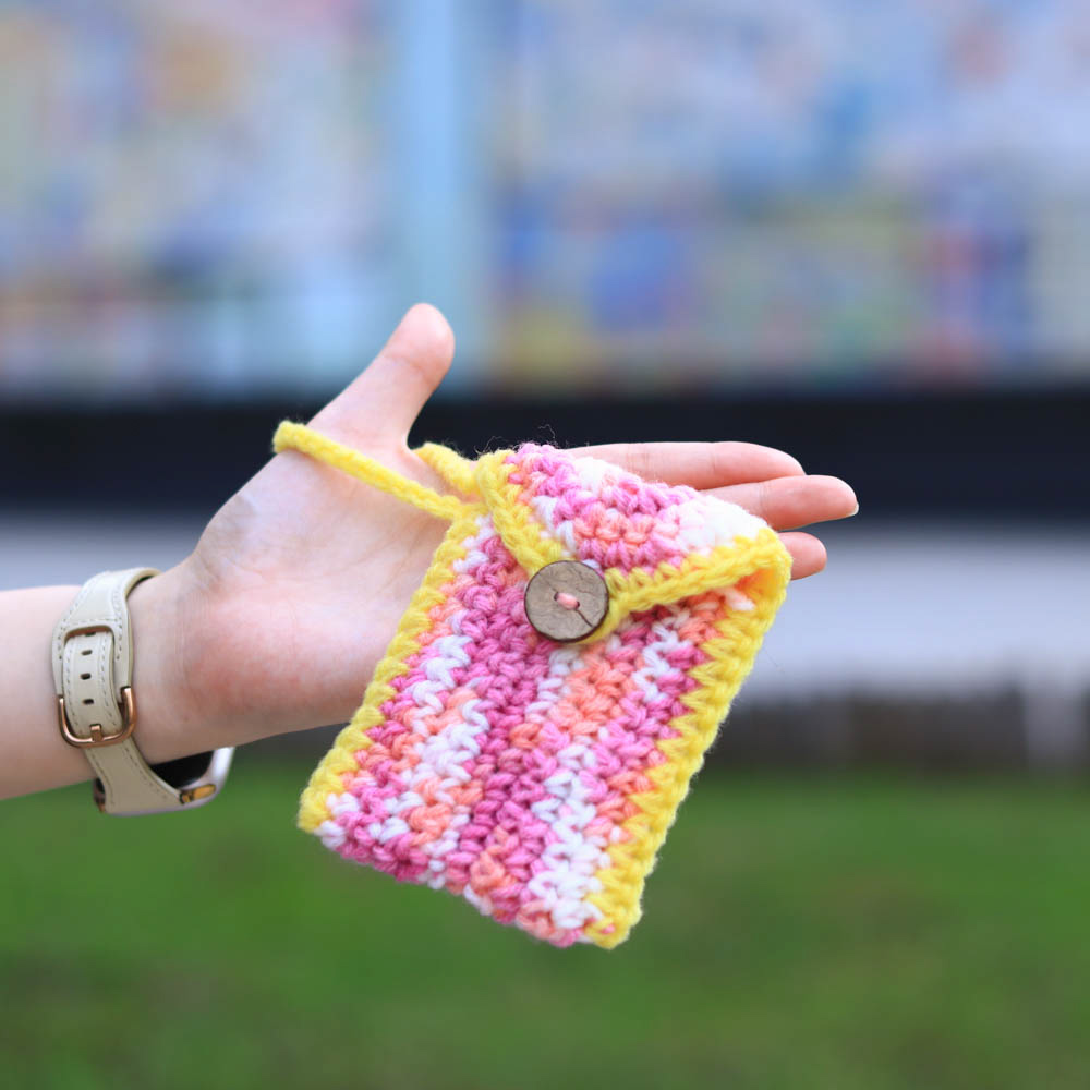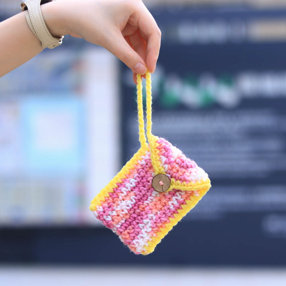 款式簡單好看的輕便小卡包,果然撞色配搭就是經典,再沉悶的圖解也能瞬間「重生」。給難以選擇配色的同學們一個小建議,任何深色+淺色的組合其實都很好看。鎖針的長度可以自由決定,把交通卡或門卡放在裡面,然後掛到包包上,超級方便。不小心弄髒的話,簡單浸泡手洗即可,主體只需要短針便可完成,是一款非常實用的初階織品,歡迎新手同學們來嘗試喔~