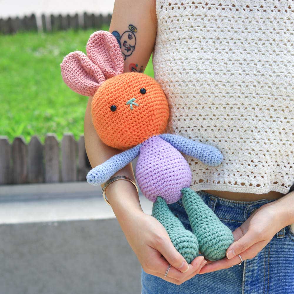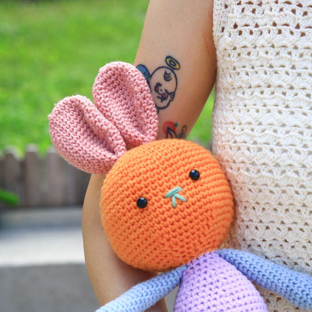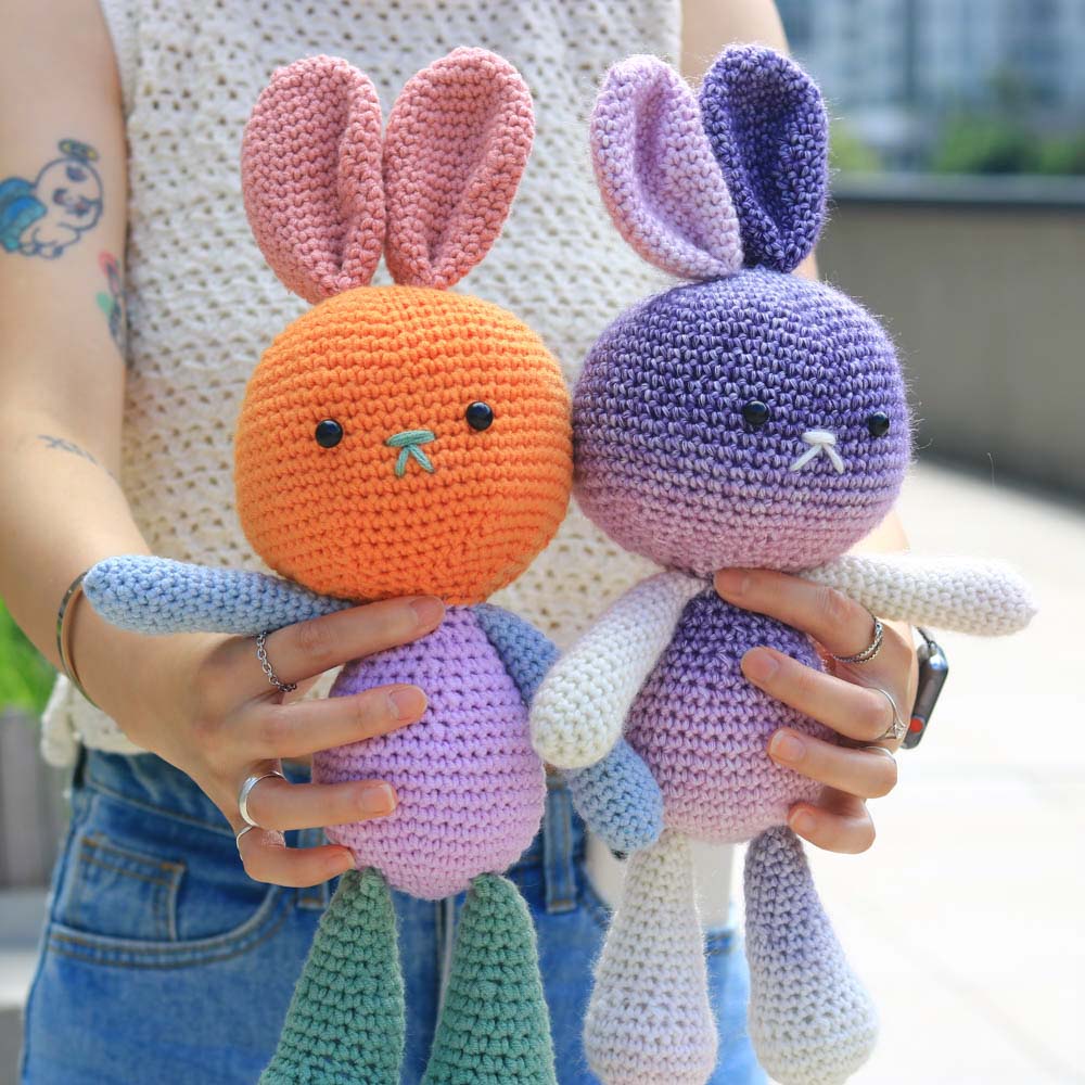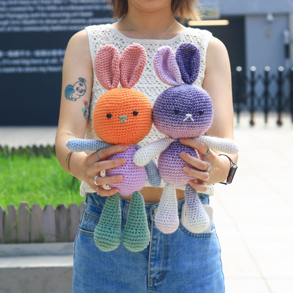 和臂彎完美契合的抱抱兔子,此為自然段染變色版本,顏色的變化顯得更有夢幻、動感,而且由於此毛線的特性,每一團的段染分佈都各有不同,因此鉤出來的兔兔也有著獨一無二的皮膚。