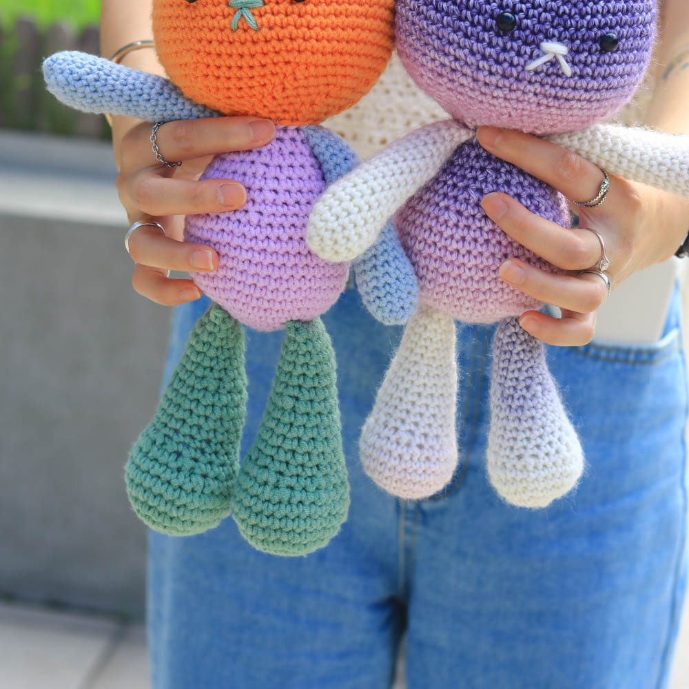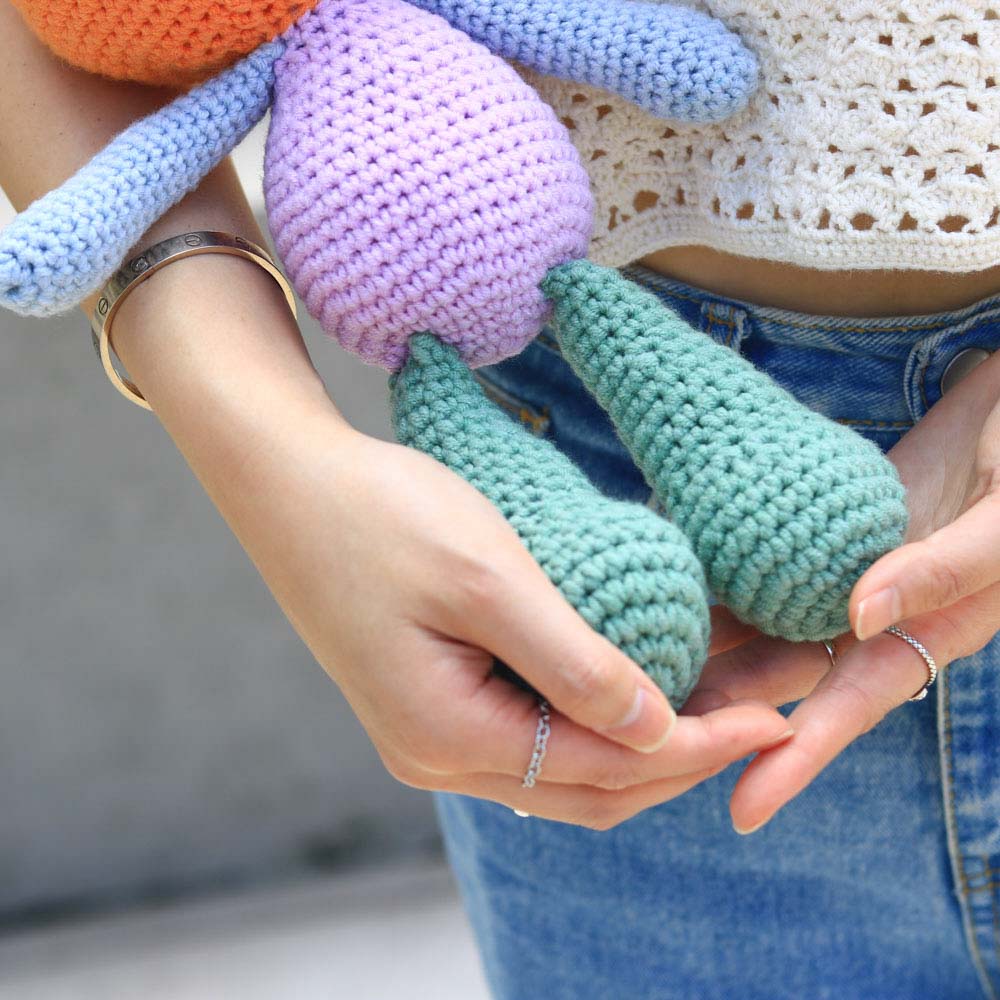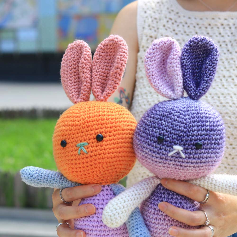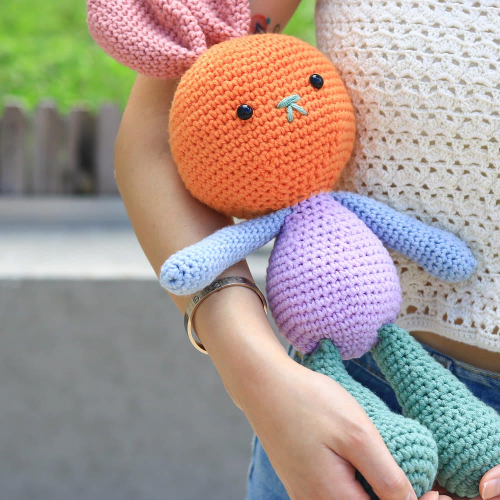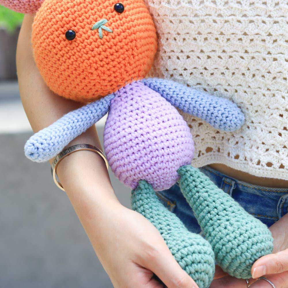 和臂彎完美契合的抱抱兔子,此為自然段染變色版本,顏色的變化顯得更有夢幻、動感,而且由於此毛線的特性,每一團的段染分佈都各有不同,因此鉤出來的兔兔也有著獨一無二的皮膚。