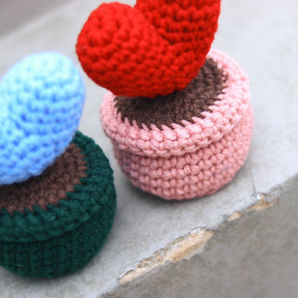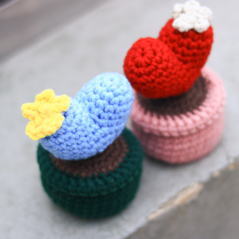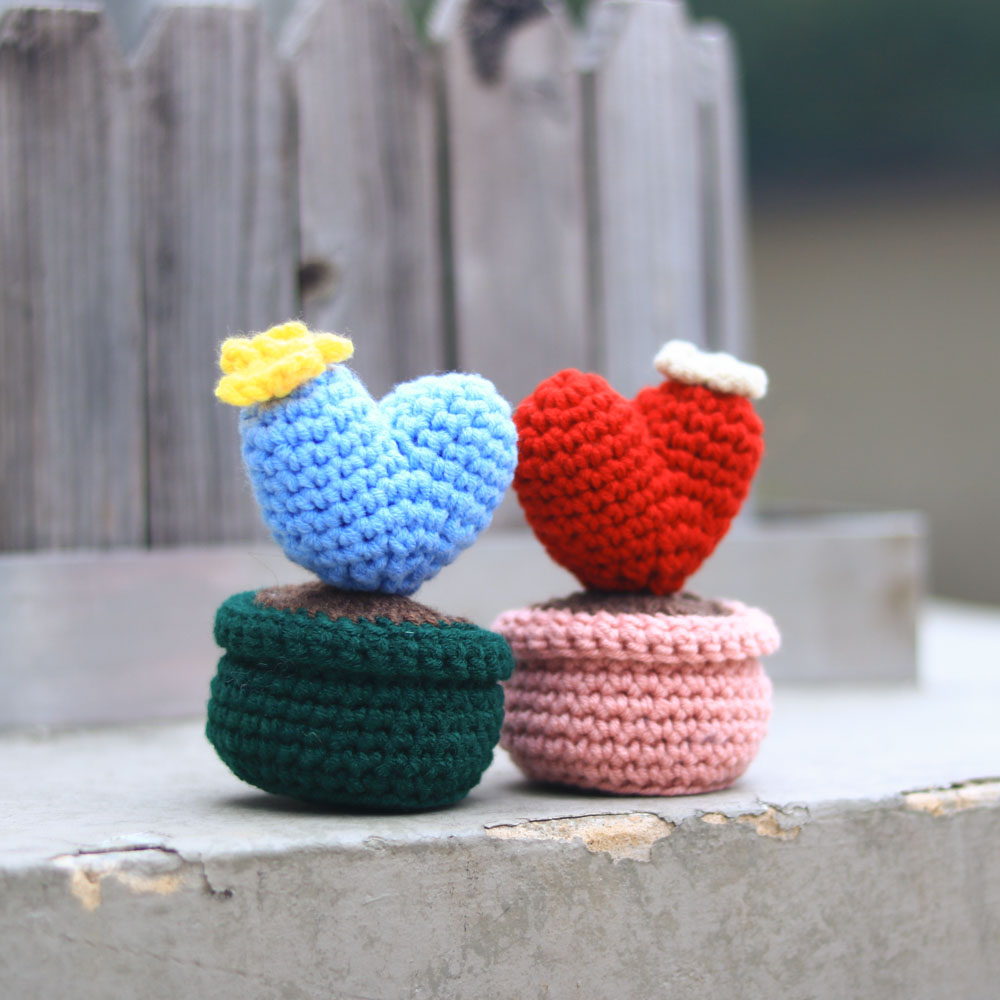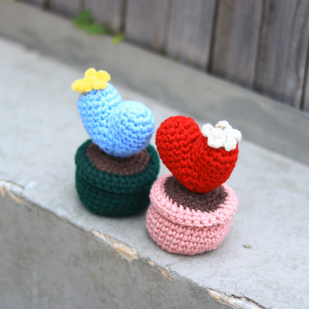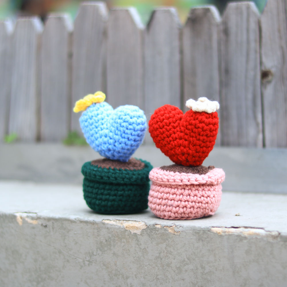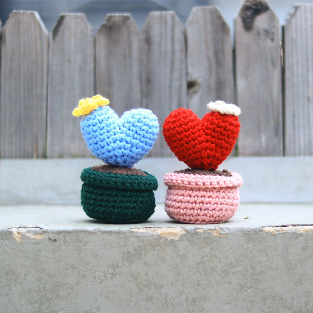 你看,盆栽上長出了顆愛心耶!愛心上還有朵小花呢,小小的一個,尺寸剛好合適擺放在桌上,每次不經意看到時,都會感到十分治癒吧。此外,這樣愛心元素滿滿的織品,也很適合用來表達愛意,乾脆鉤織一對愛心盆栽,把美好的寓意寄托在他們身上吧!