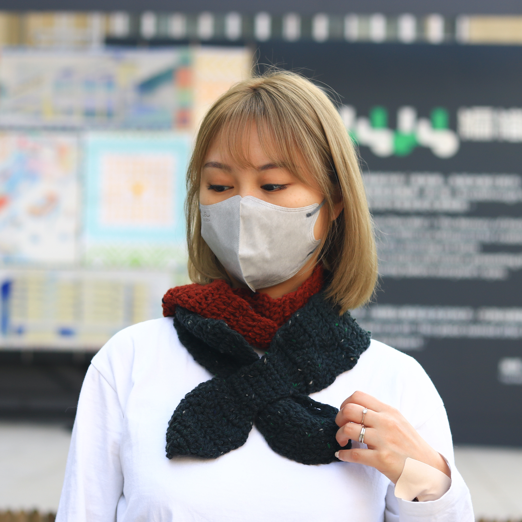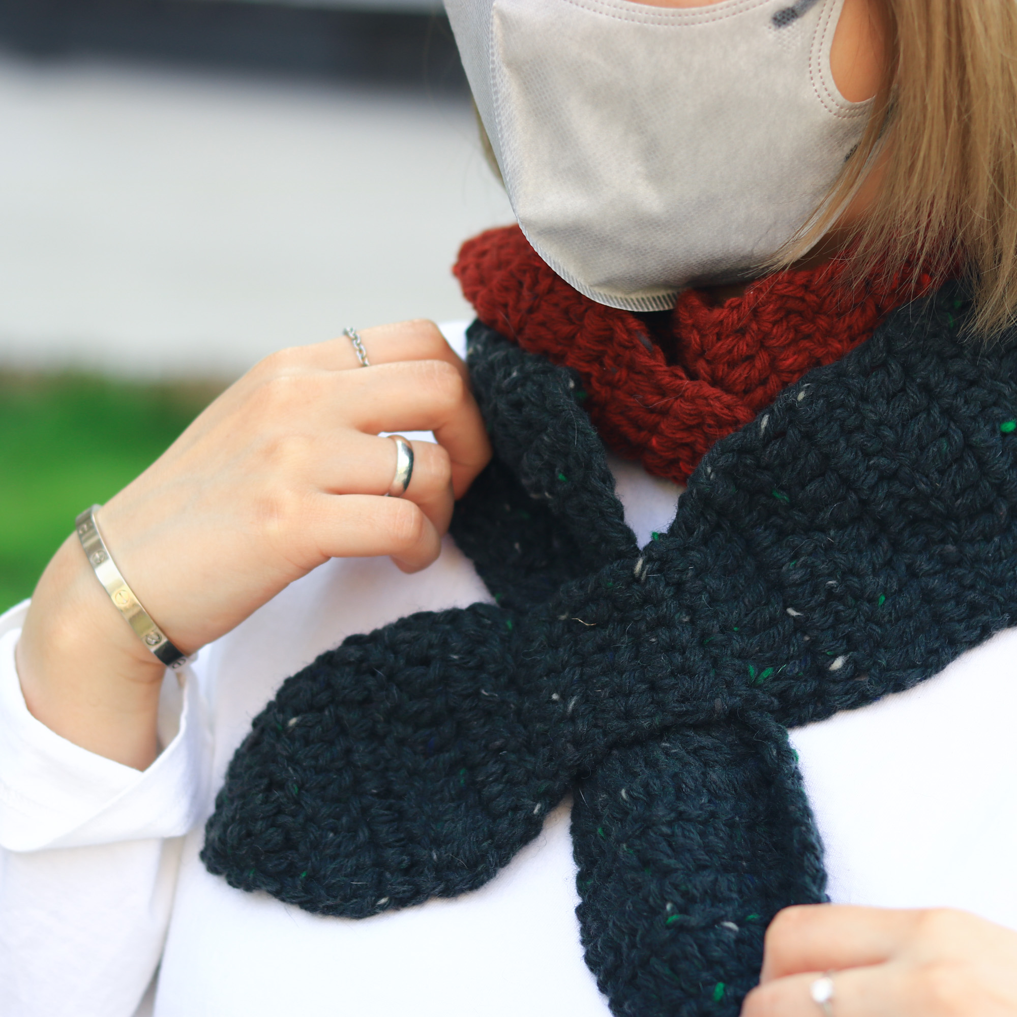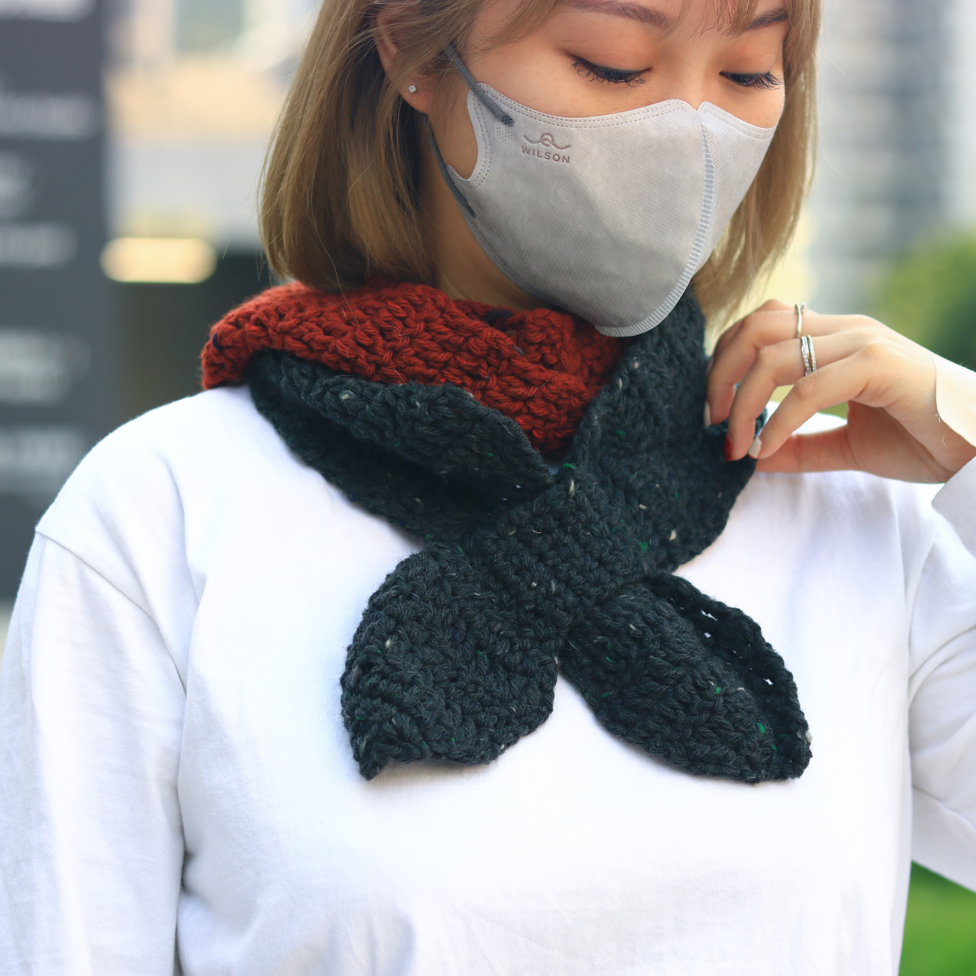 雙色長蝴蝶圍巾既美觀,同時相比短蝴蝶圍巾有更強的保暖性,長長的圍巾能夠圍著脖子繞兩圈,然後再將其中一端套入小圈固定,馬上便會溫度上升,溫暖一整個冬天。