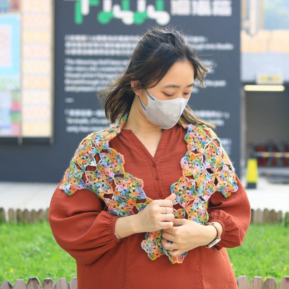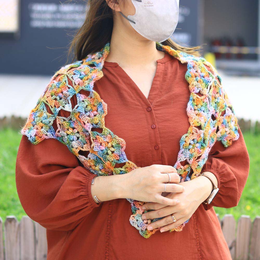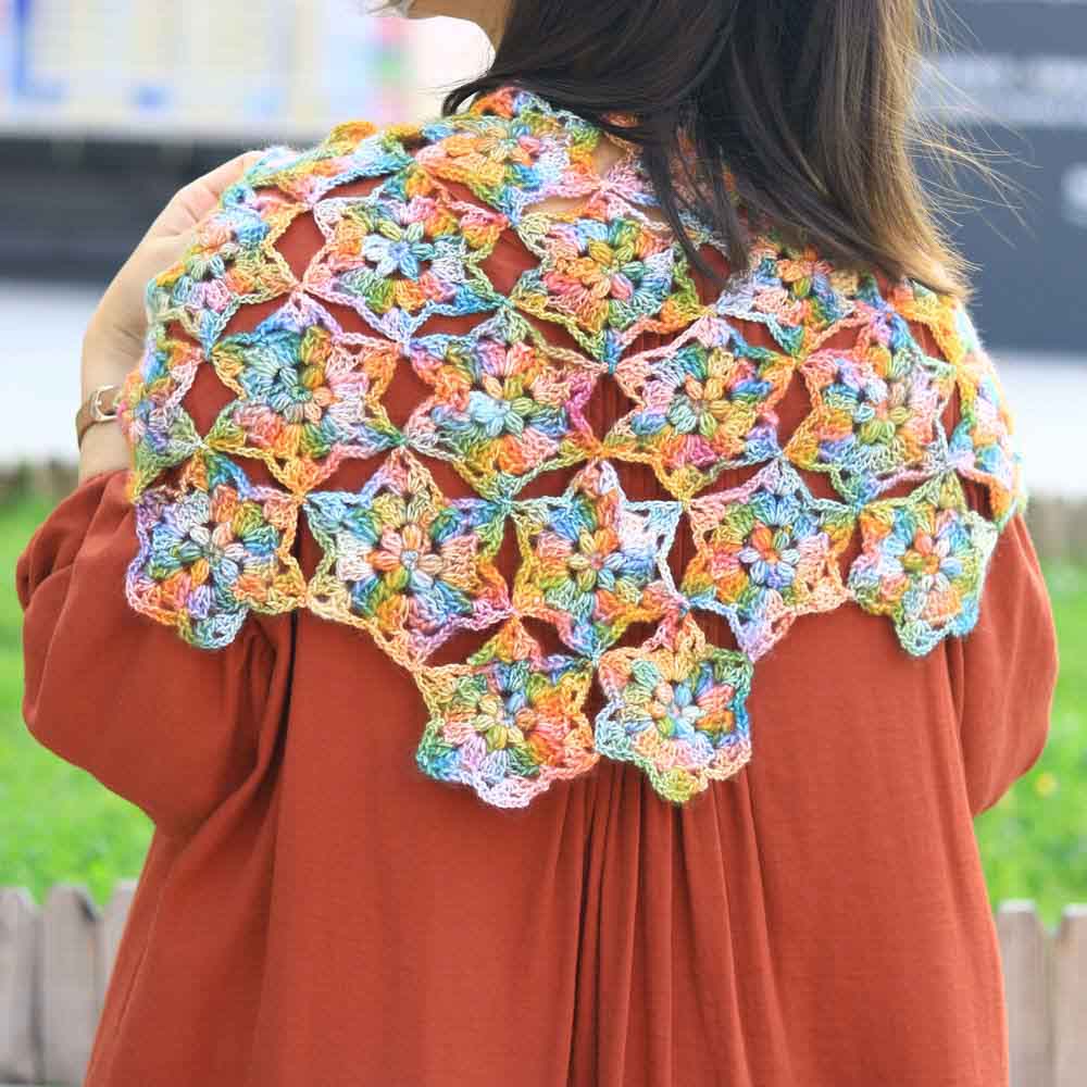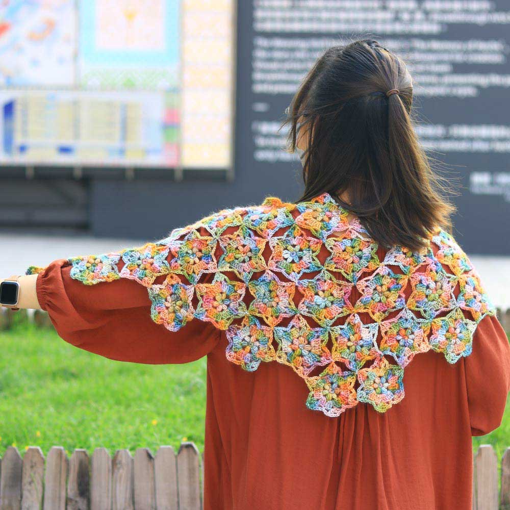由40塊星星織片組成,設計非常細緻,星星每個折角都活靈活現地勾勒了出來。如果顏色挑選得當,更能形成加倍的美貌,比如唧唧的示範款式,利用七彩的段染色,令星星呈現華麗的萬花筒色,非常吸睛。採用「邊鉤邊拼」的縫合方式,而非把所有織片完成後再作統一縫合。這種方法除了較方法,也能盡可能讓拼接位置更加無痕,顯得隱密輕盈,是相對較進階的技法。