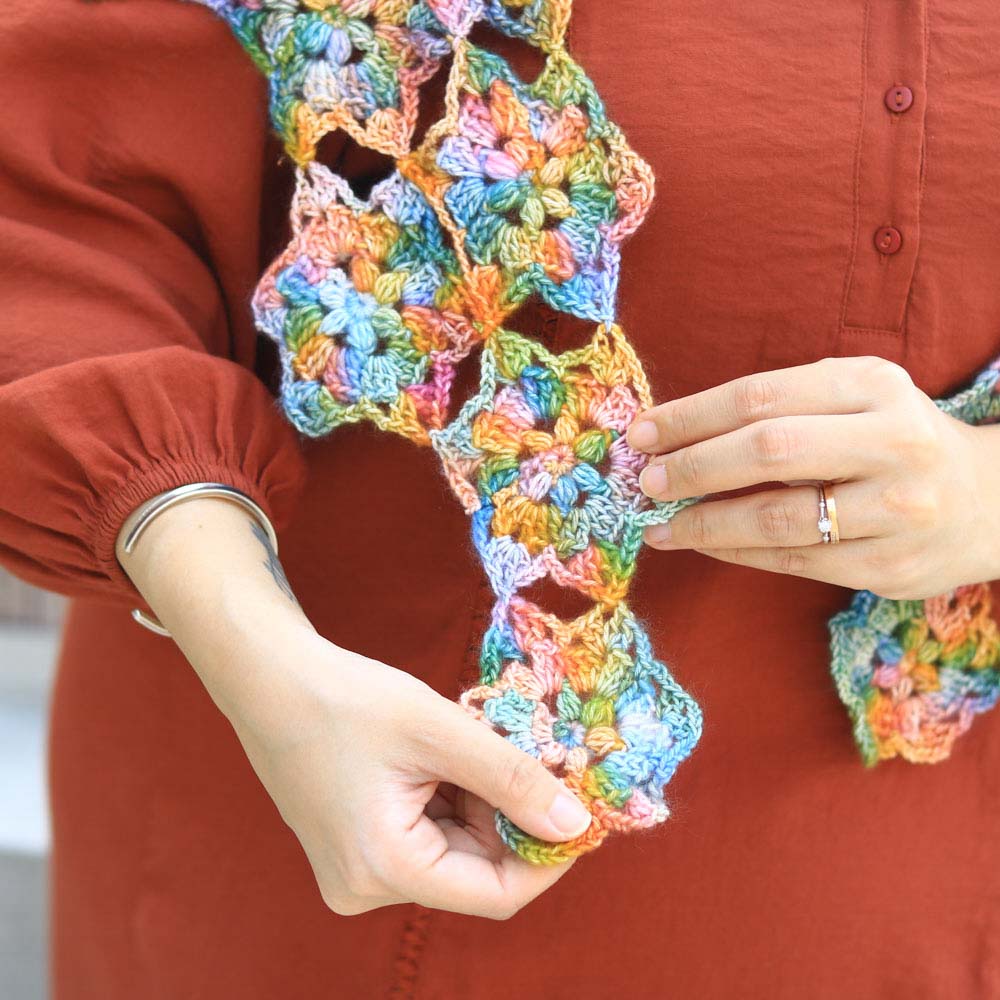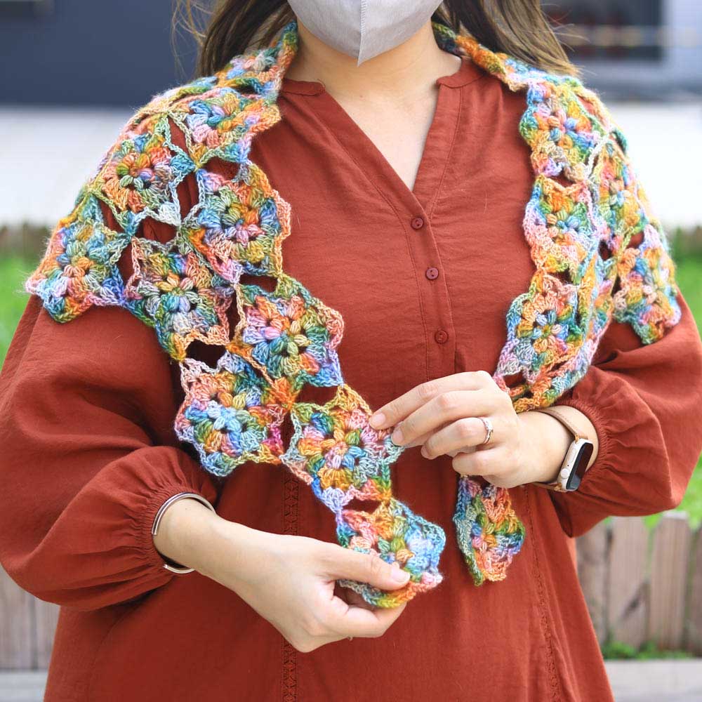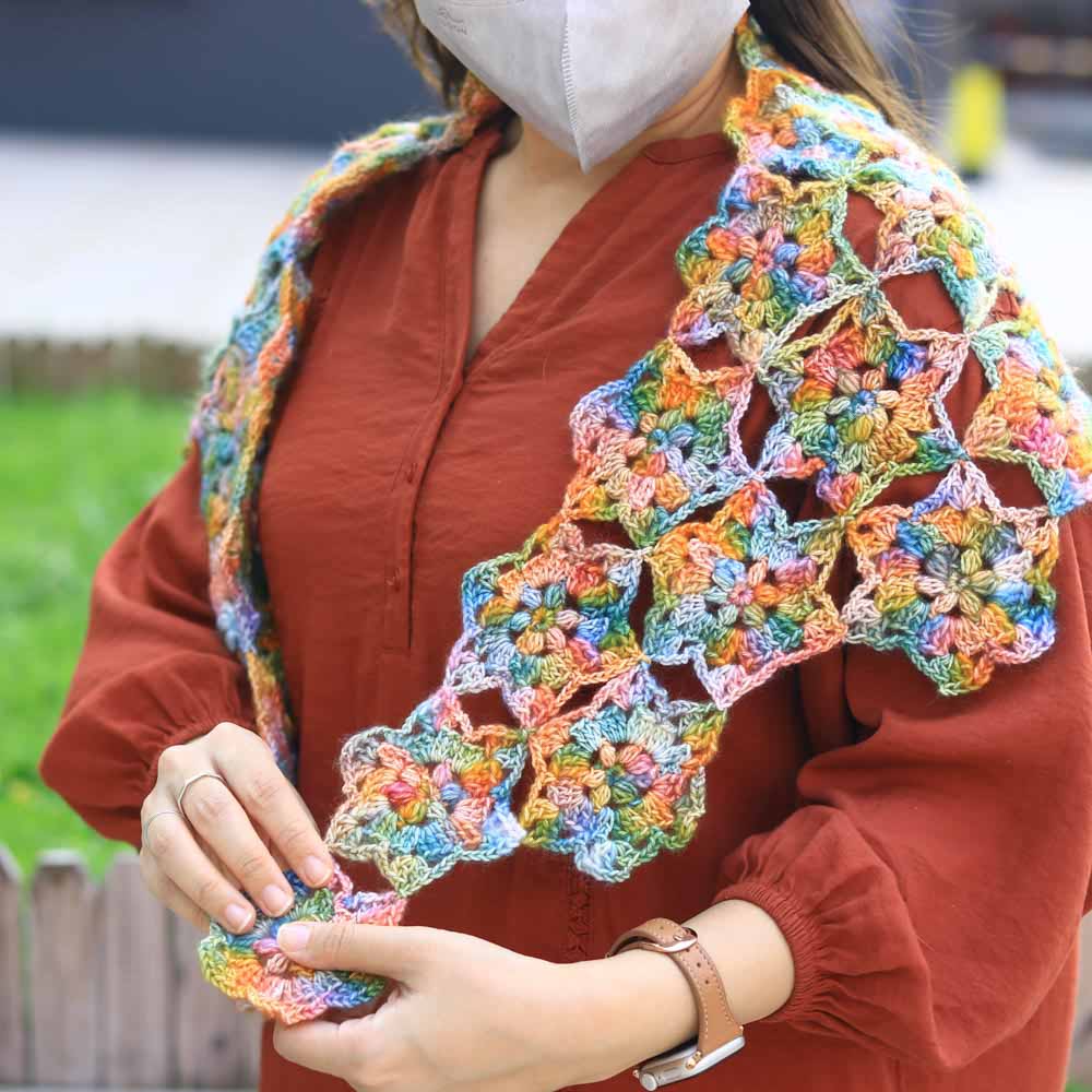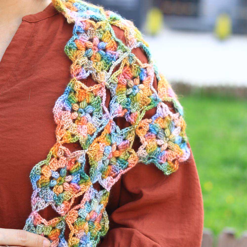 由40塊星星織片組成,設計非常細緻,星星每個折角都活靈活現地勾勒了出來。如果顏色挑選得當,更能形成加倍的美貌,比如唧唧的示範款式,利用七彩的段染色,令星星呈現華麗的萬花筒色,非常吸睛。採用「邊鉤邊拼」的縫合方式,而非把所有織片完成後再作統一縫合。這種方法除了較方法,也能盡可能讓拼接位置更加無痕,顯得隱密輕盈,是相對較進階的技法。
