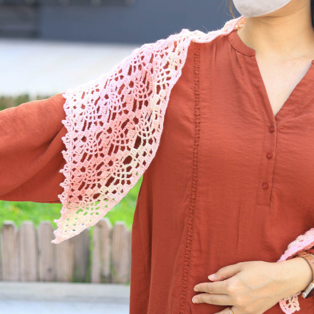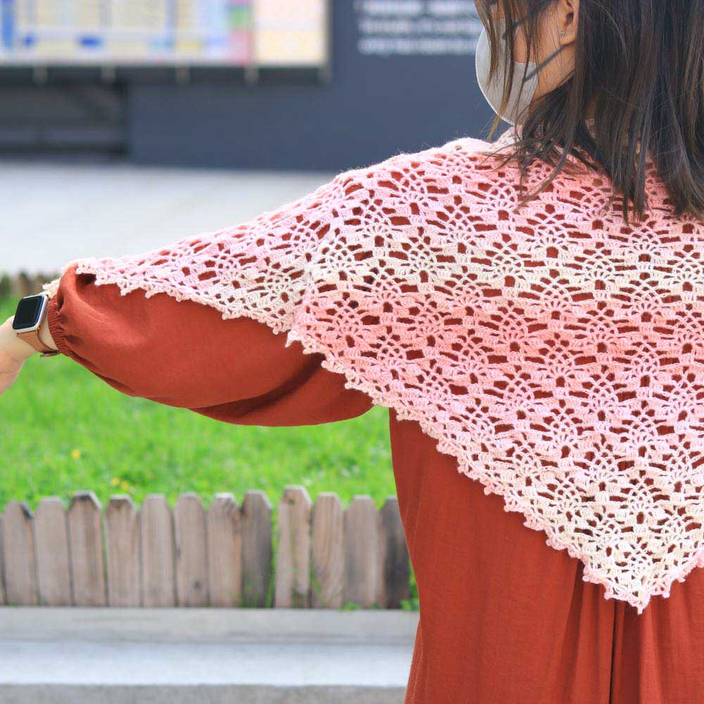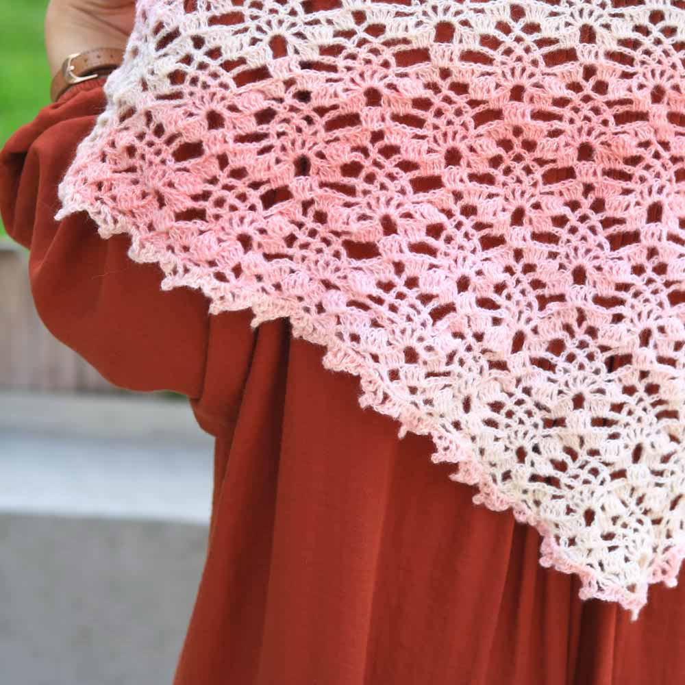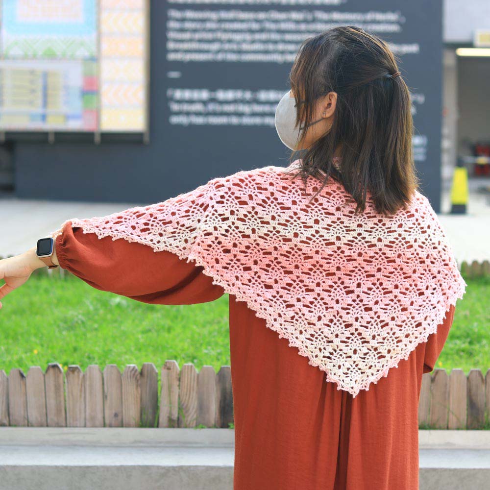 鳳梨花紋是鉤織品中最常用的花紋之一,除了手袋,在圍巾、披肩類織品也很常見。這款披肩所使用的是簡易版的鳳梨花紋,以鎖針勾勒而成,乍看之下更像是重重花瓣。在披肩之中也是相對簡單的圖解~