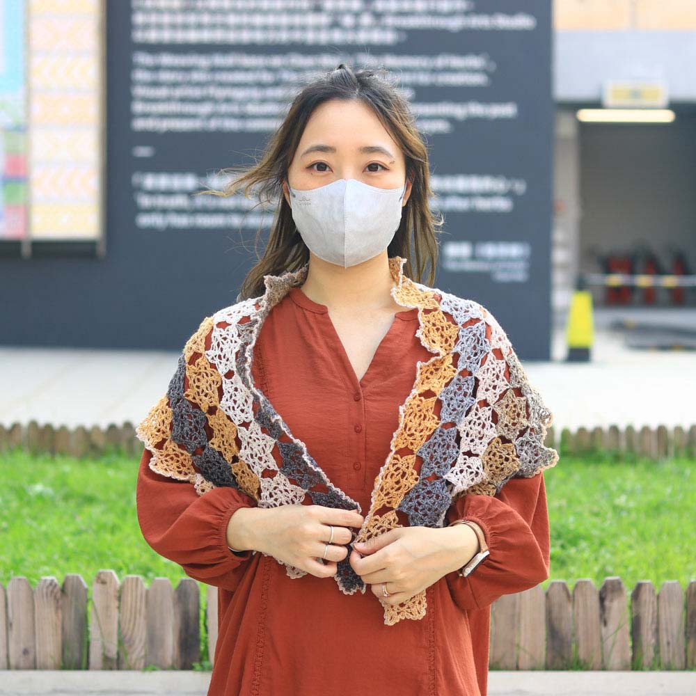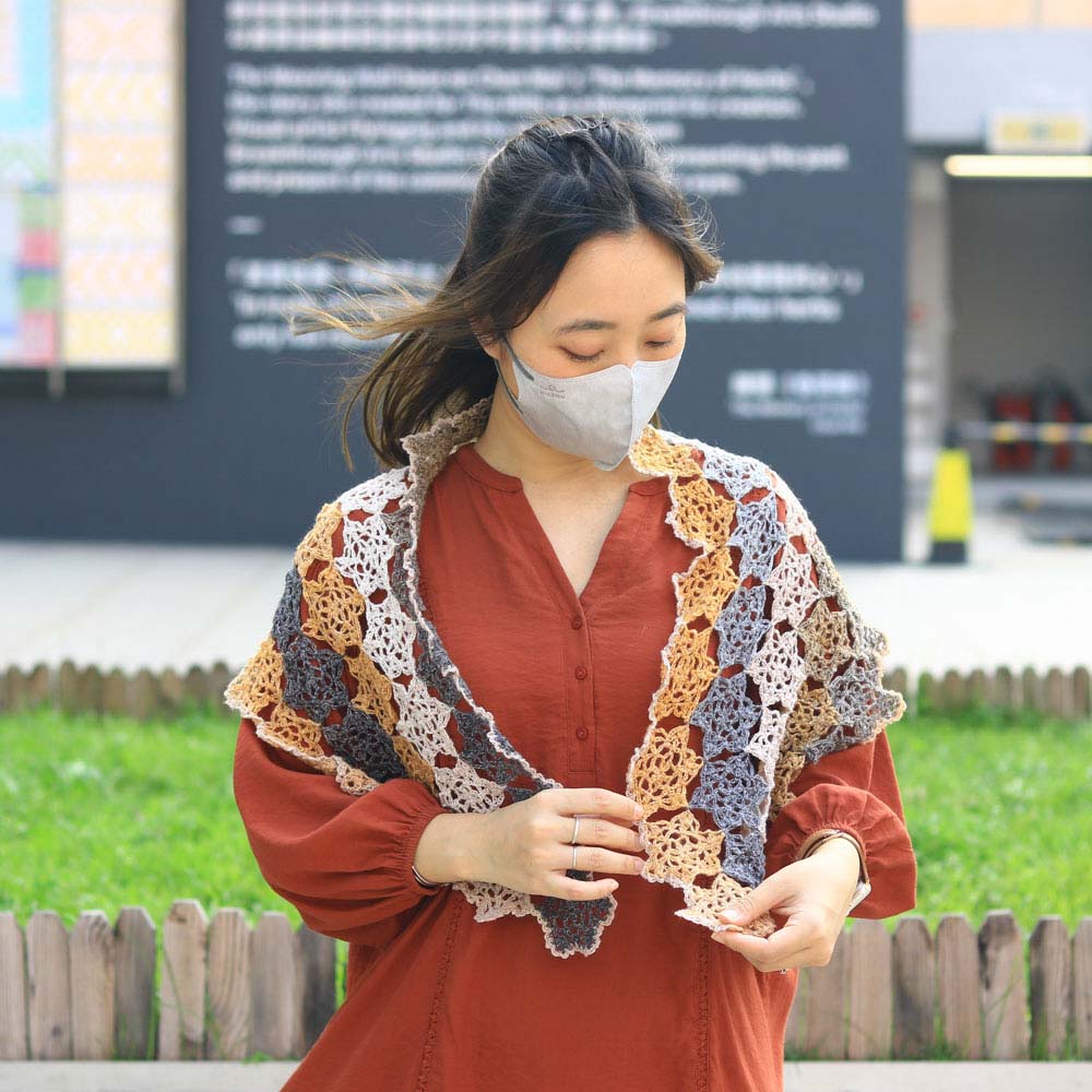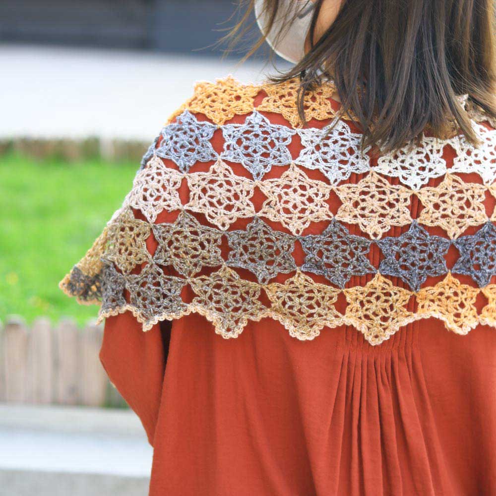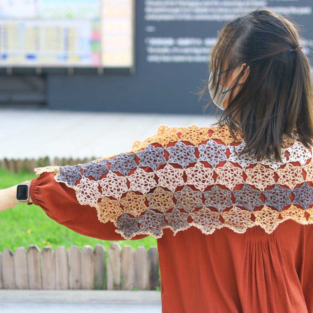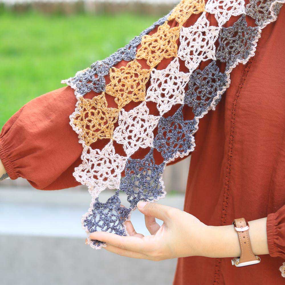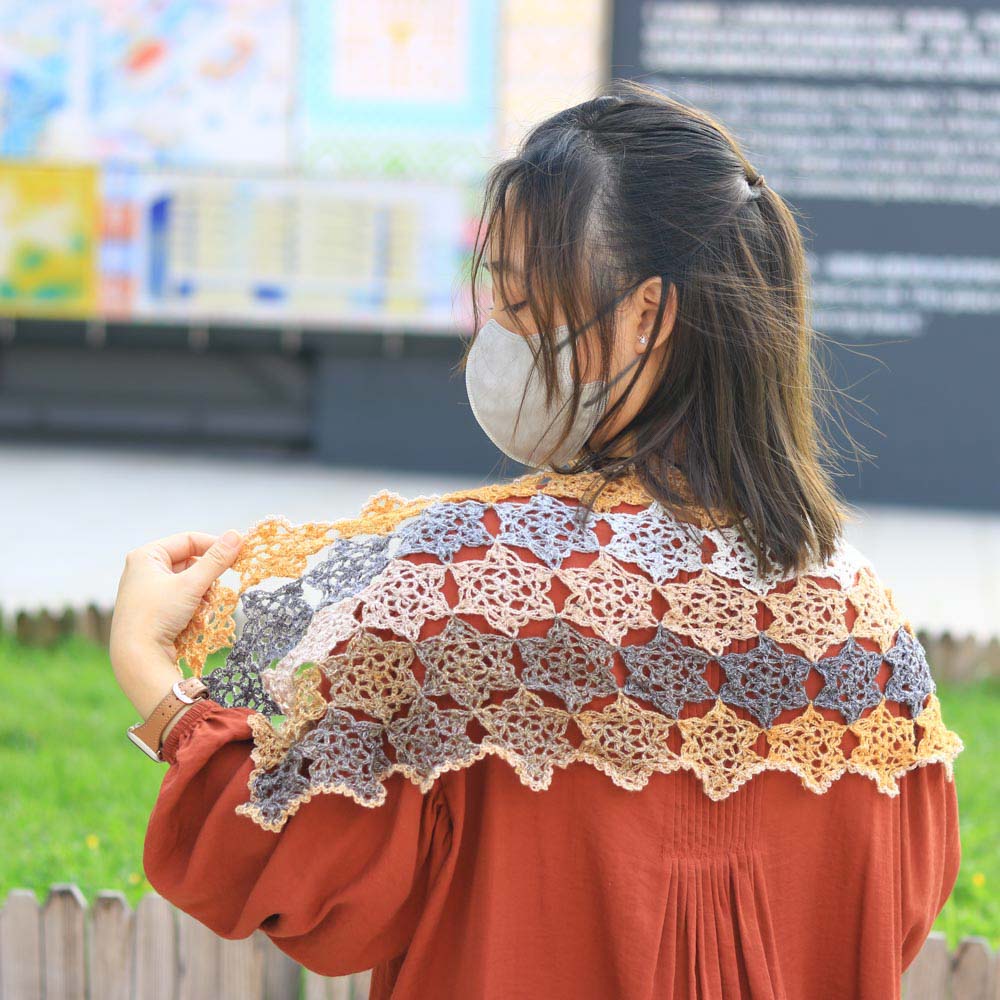 這款披肩由75塊精緻的鏤空星星織片組合而成,喜歡漂亮鏤空圖案的織友千萬不要錯過。具體採用「邊鉤邊拼」的縫合方式,而非把所有織片完成後再作統一縫合。這種方法除了較方法,也能盡可能讓拼接位置更加無痕,顯得隱密輕盈,是相對較進階的技法。