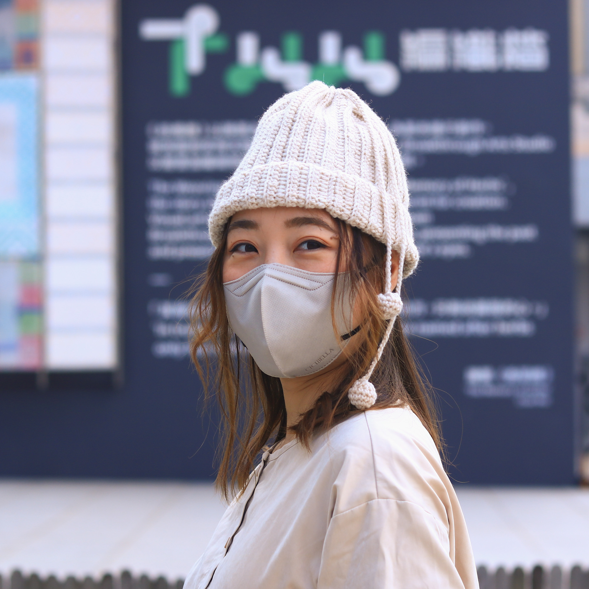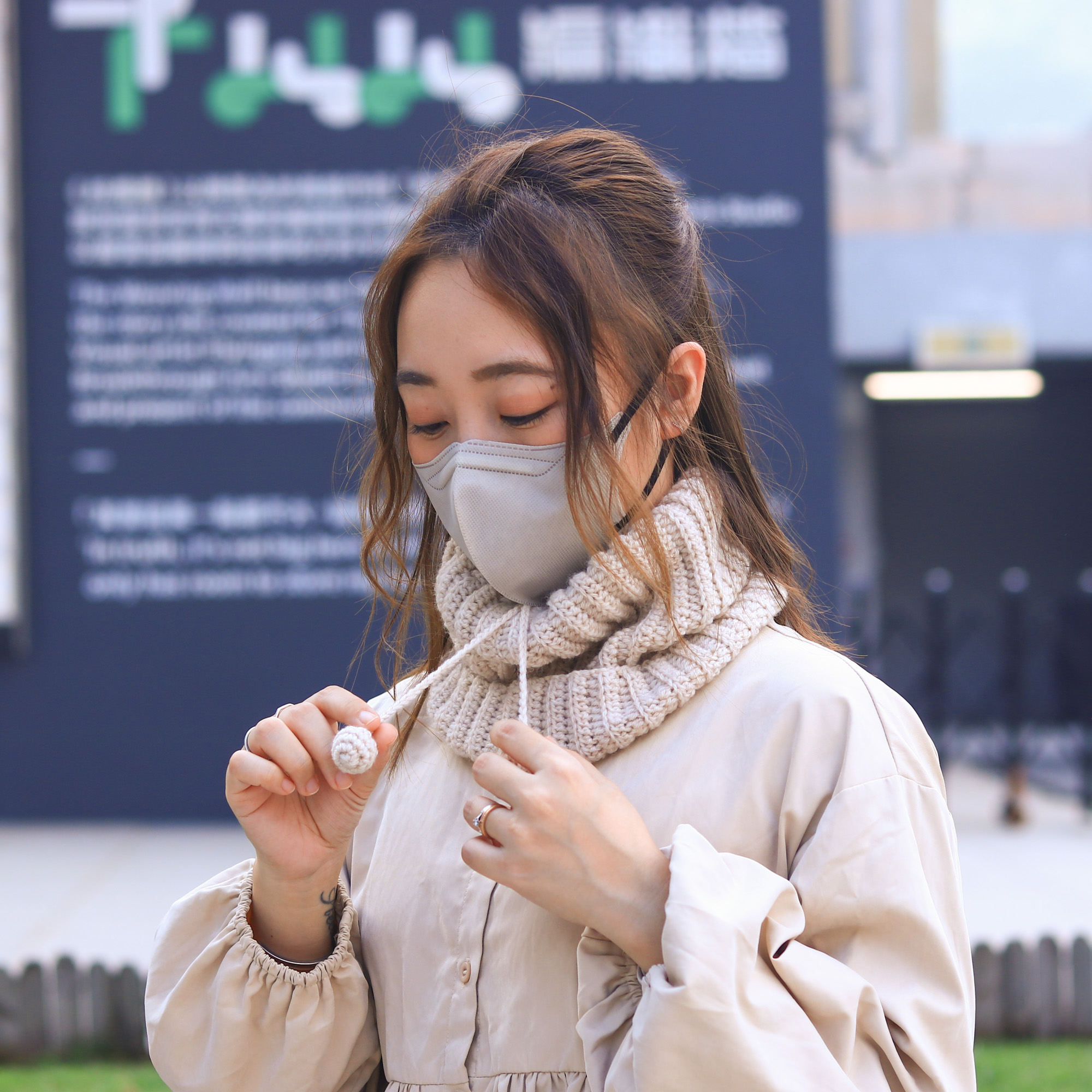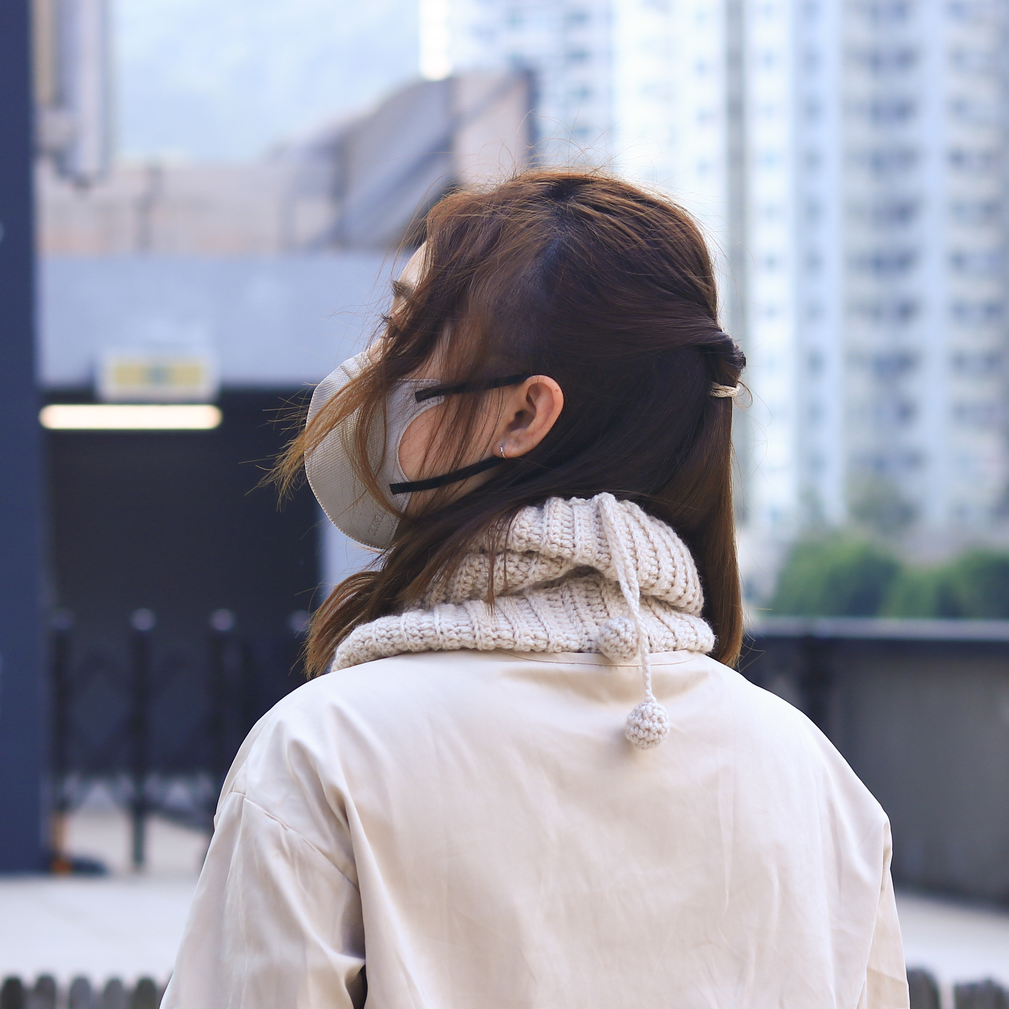 超級實用的一款鉤織圍脖,可以輕鬆在兩副面貌之間切換。只要把束口維持放鬆狀態,作為當圍脖使用。另一邊廂,也可作為毛線帽使用,只要把一端的束口拉緊,便能使它牢牢地固定在頭上,束口的帶子則會變成裝飾,垂在腦後勺輕輕搖晃。