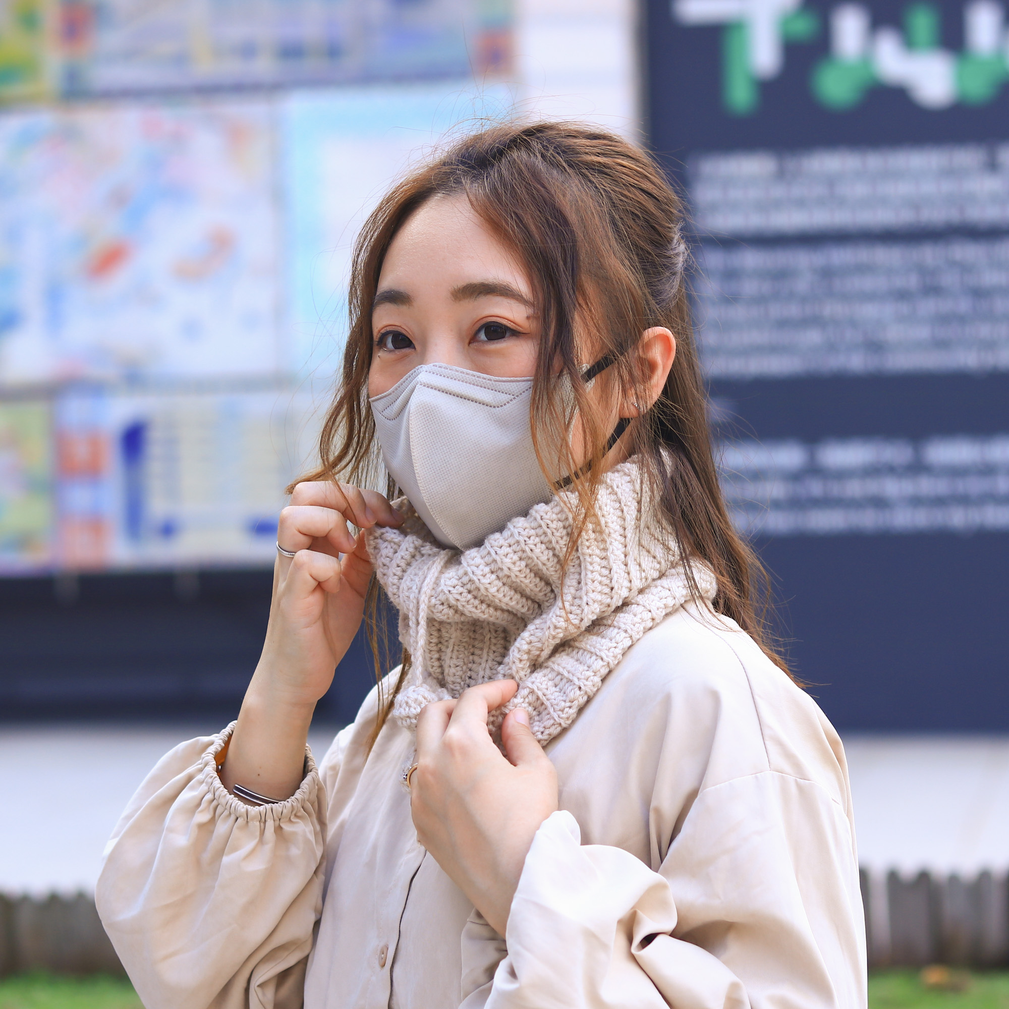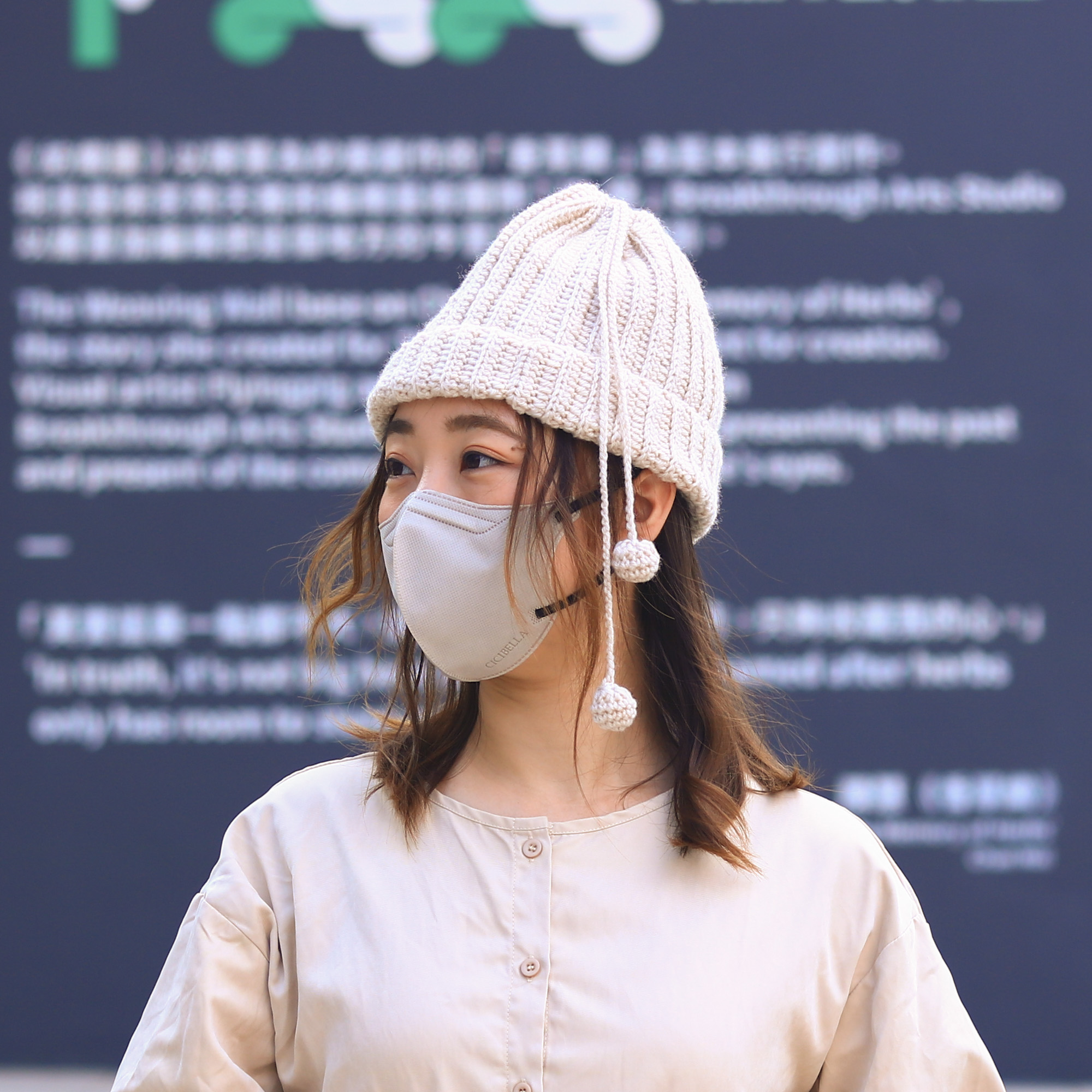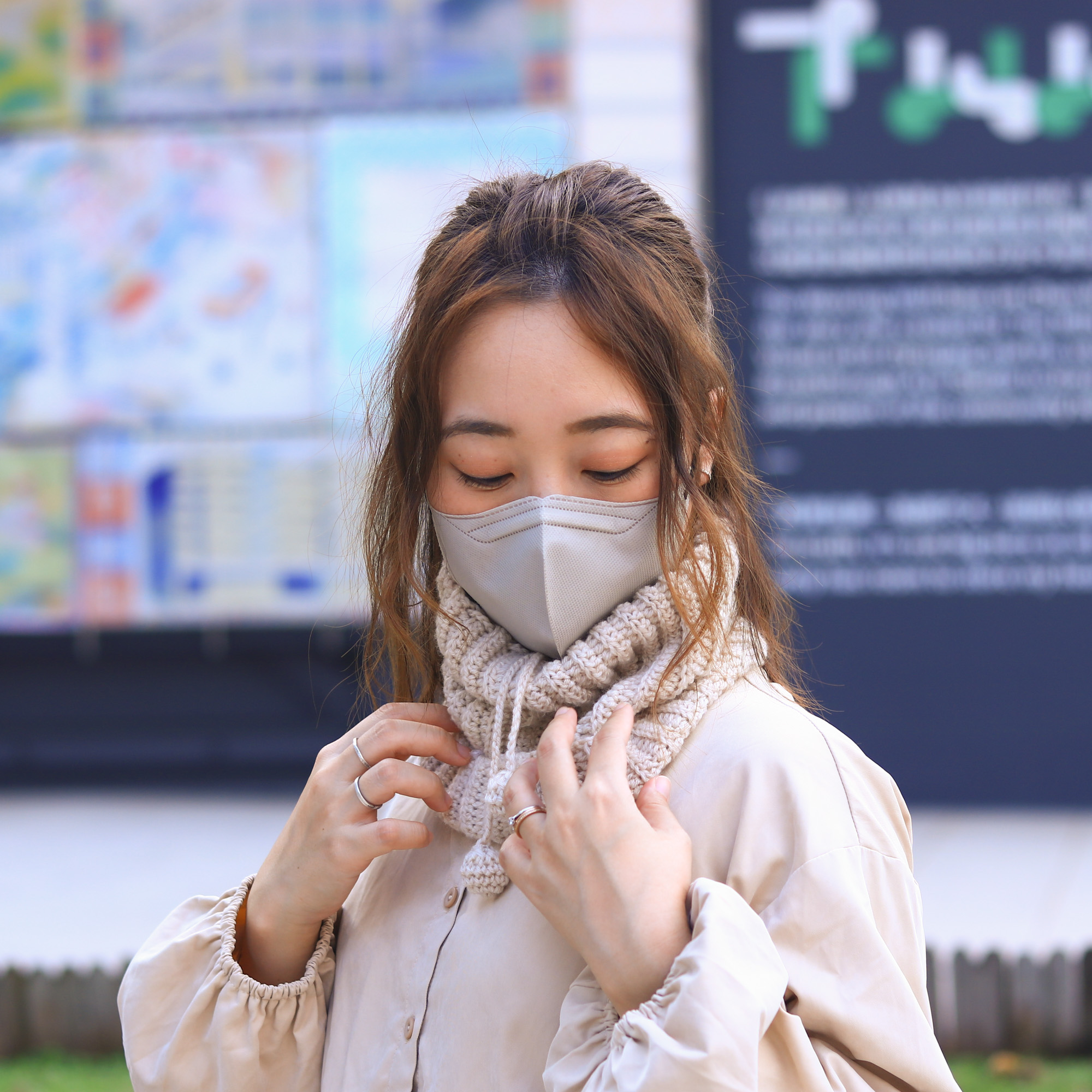 超級實用的一款鉤織圍脖,可以輕鬆在兩副面貌之間切換。只要把束口維持放鬆狀態,作為當圍脖使用。另一邊廂,也可作為毛線帽使用,只要把一端的束口拉緊,便能使它牢牢地固定在頭上,束口的帶子則會變成裝飾,垂在腦後勺輕輕搖晃。