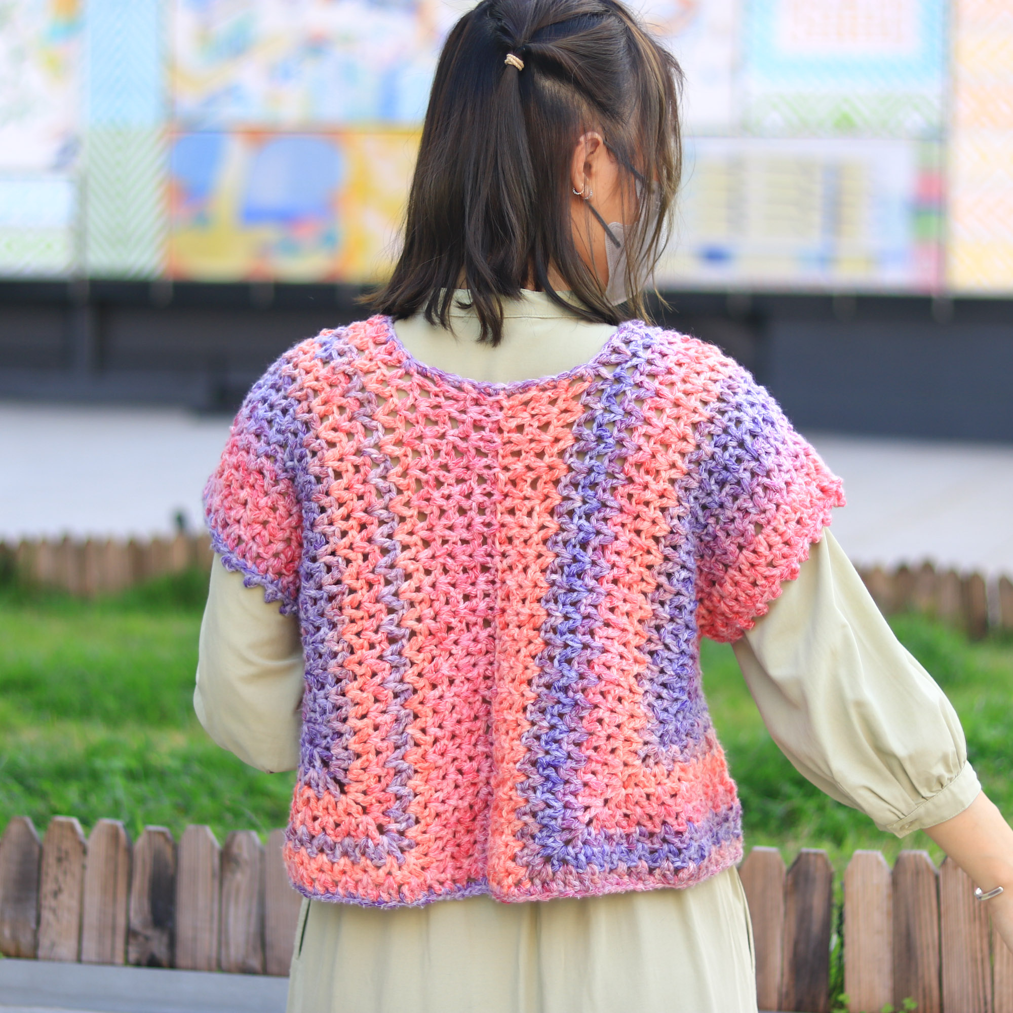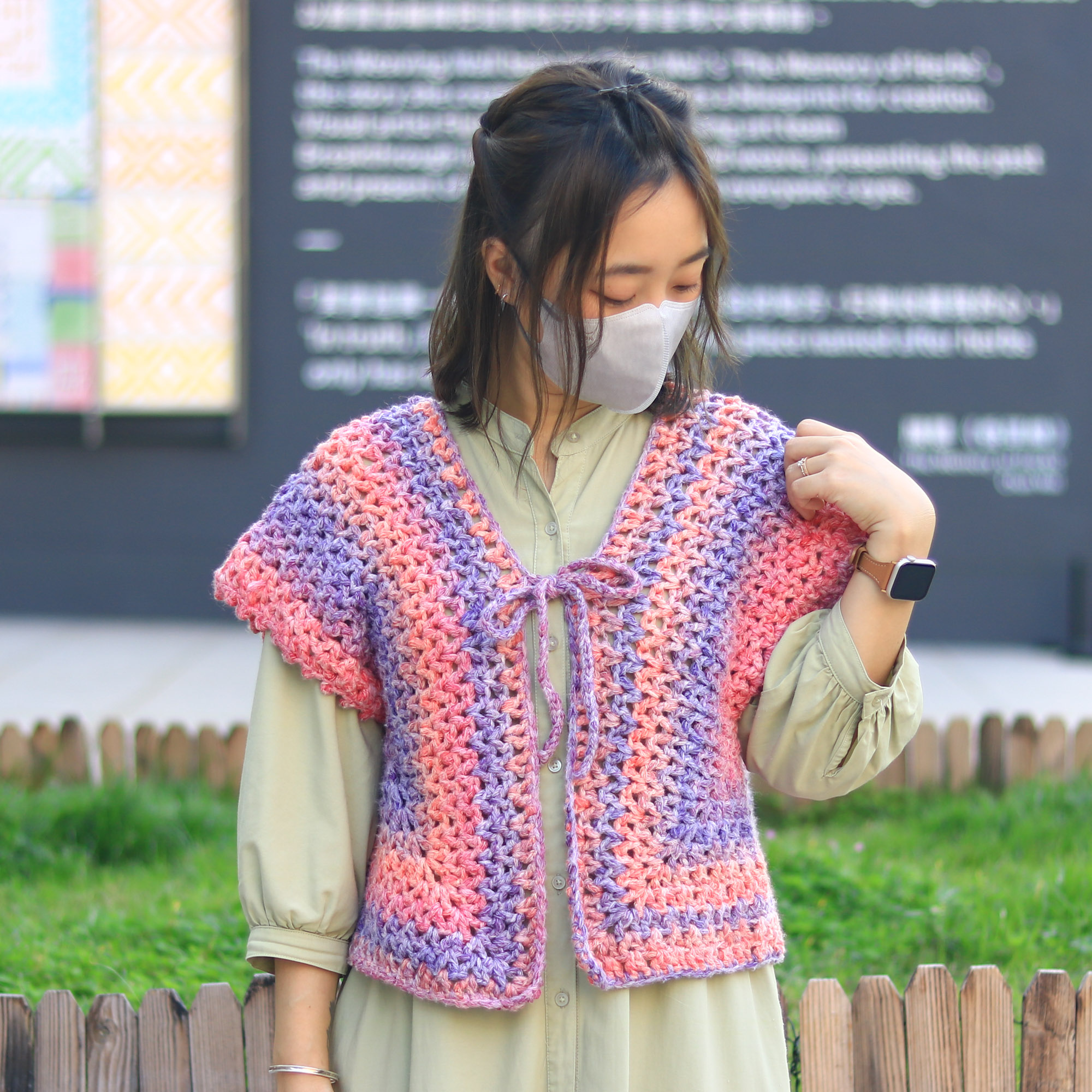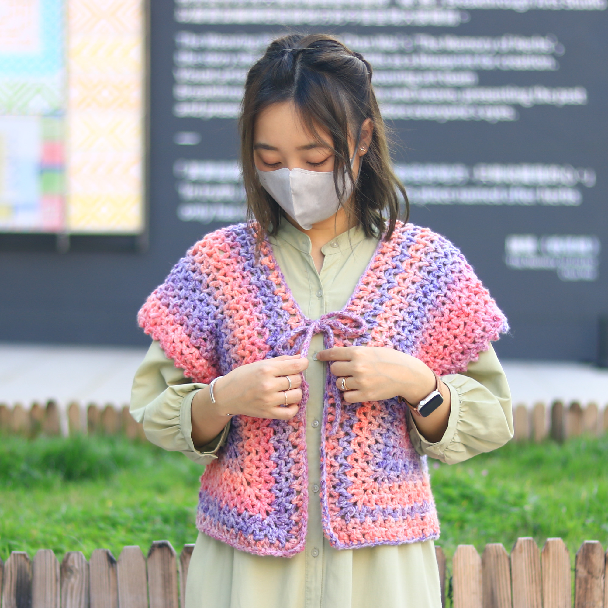 很適合秋日氣候的一件短袖外搭,裏面搭配一件薄薄的上衣相信已經能夠抵禦秋日的涼意,特意在袖口邊加上結粒圍邊,添上幾分俏皮可愛。
