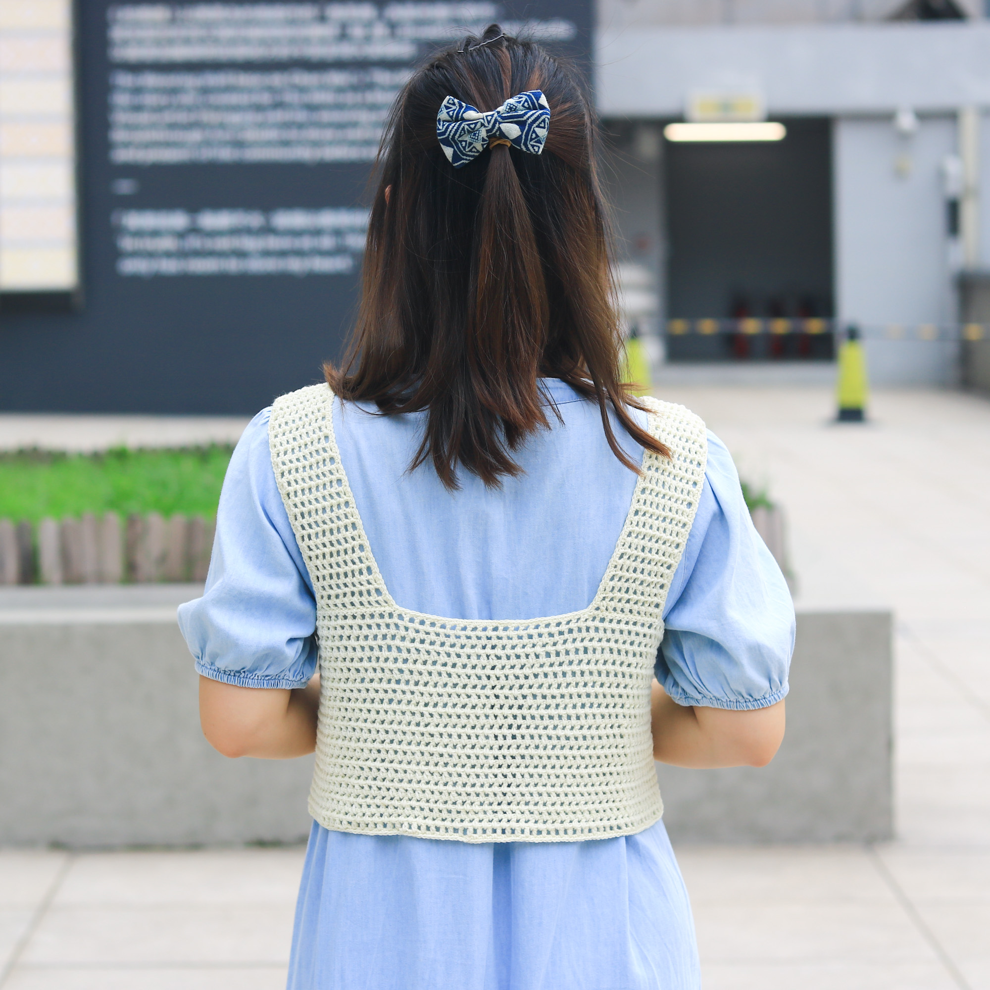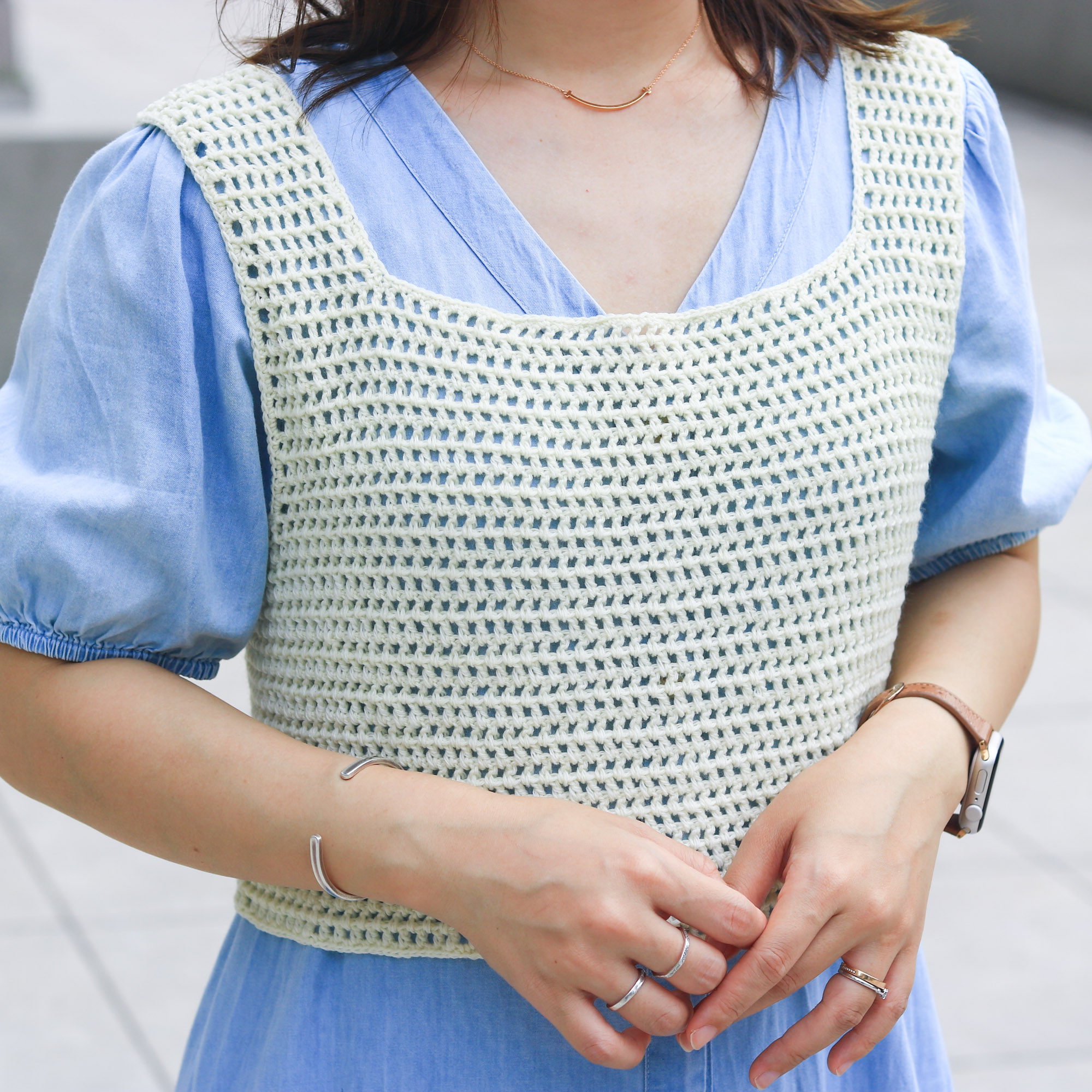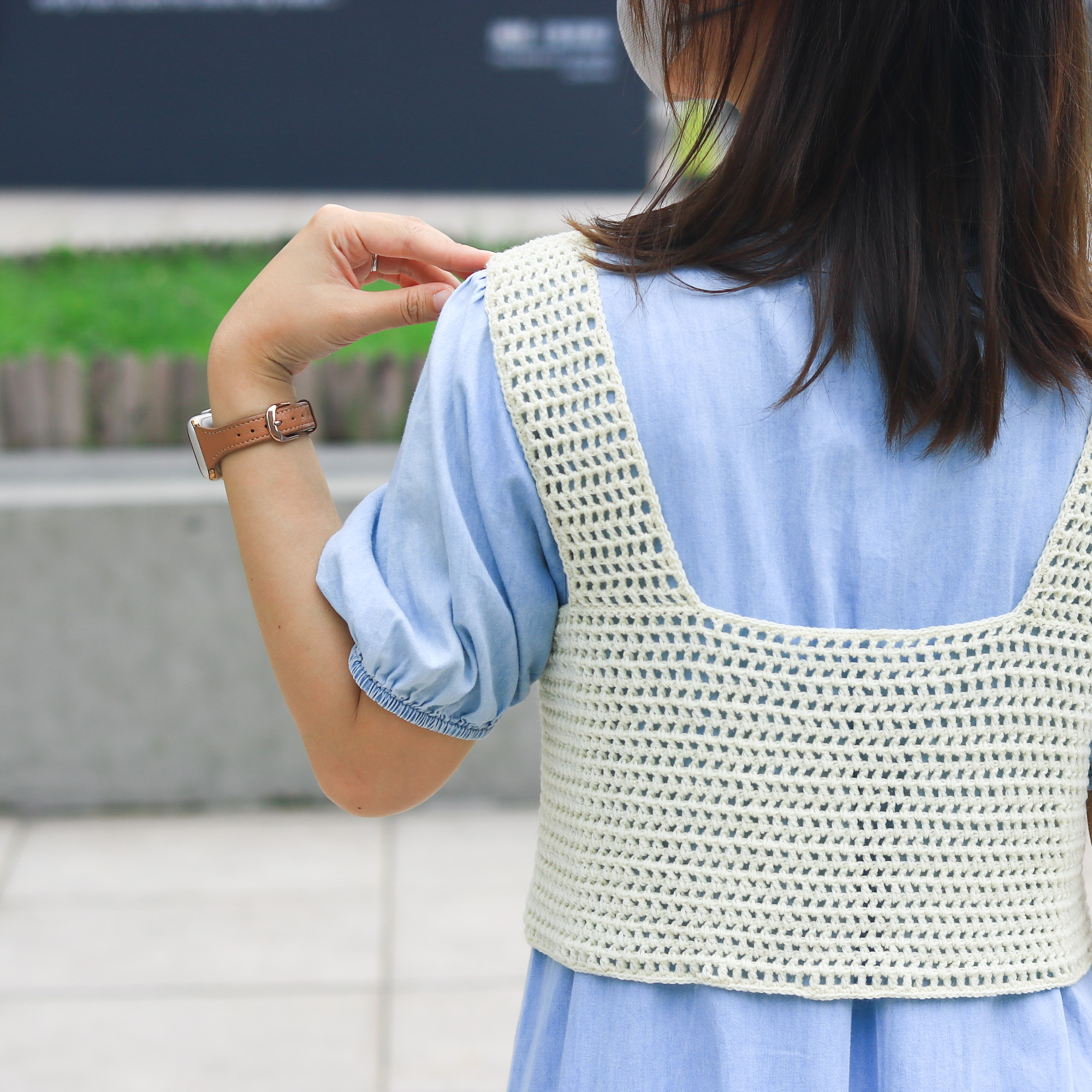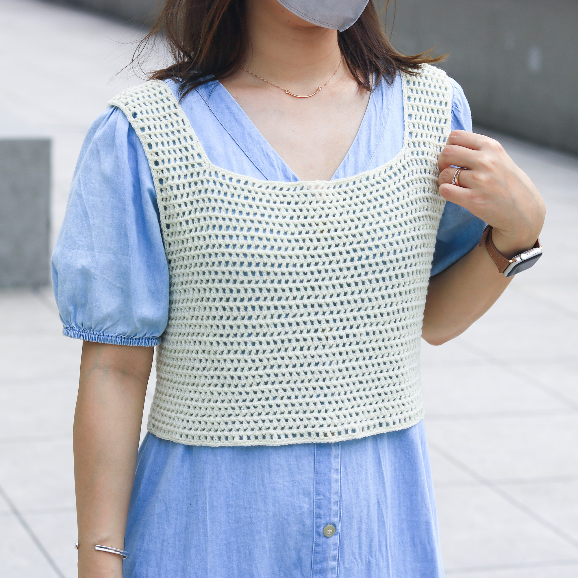 外搭背心真的是永遠都不嫌多,使用長針與鎖針,簡單又好看的短款網格背心便大功告成。搭配素色長裙或上衣,無論是夏日或者秋日都顯得清爽活潑。
